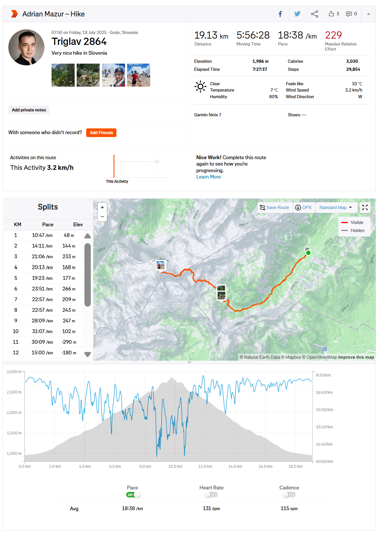 Everything aligned on Triglav, weather, pace, and energy. After the previous days of heat and travel, the cool alpine air felt like a gift. I moved quickly up the valley, reaching the summit at 12:10, just over four hours from the start.